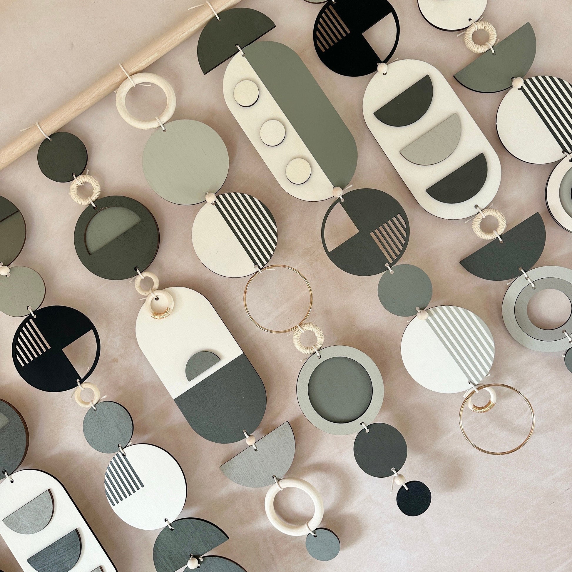 This large modern wall art hanging will make for a great statement piece in your home decor great for filling an empty wall with some interest. This geometric wall hanging is handmade and painted in a dark colour palette of grey tones. Some pieces are left unpainted to let the natural colour of the wood show.